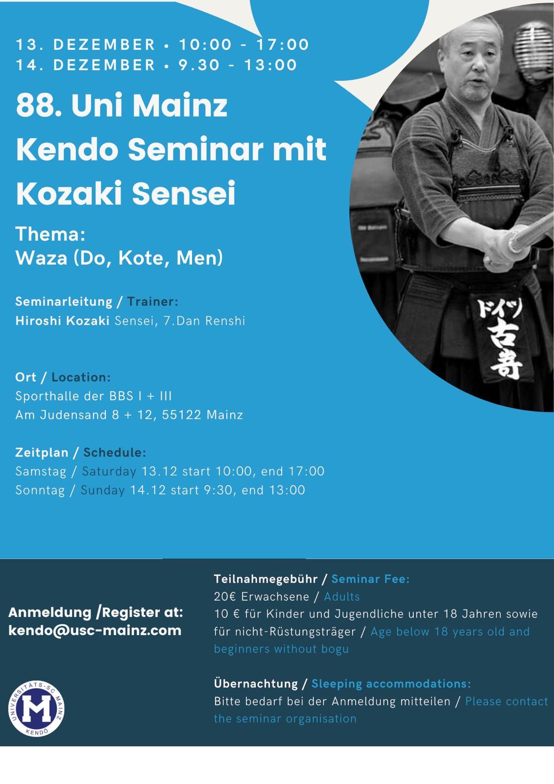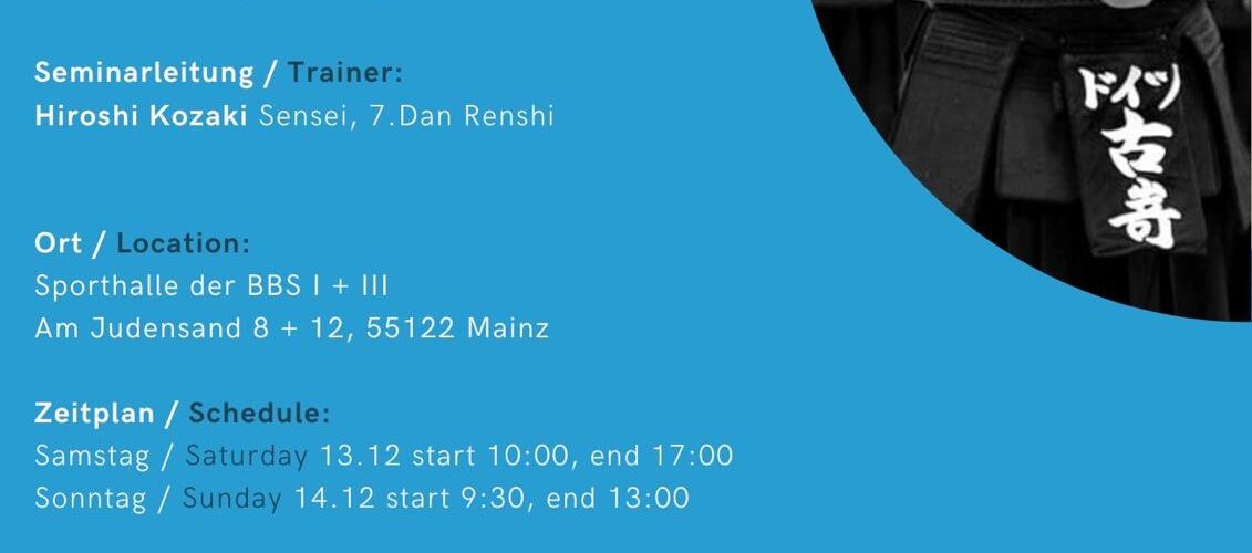 Am 13./14.12. findet in Mainz das vierte Seminar mit Kozaki Sensei für 2025 statt. Thema ‚Waza (Do, Kote, Men)‘. Kommt vorbei, wir freuen uns auf Euch!